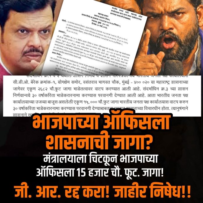 🔴मंत्रालयाच्या बाजूला महाराष्ट्र शासनाच्या जागेवर भारतीय जनता पार्टीला पंधरा हजार चौरस फूट जागा ऑफिस साठी देणारा जीआर रात्री जाहीर करण्यात आलेला आहे, हे धक्कादायक आहे. पंधरा हजार चौरस फूट म्हणजे दीड लाख स्क्वेअर फिट जागा पक्षाच्या ऑफिससाठी दिली जात आहे. या जागेसाठी एक जानेवारी 2025 ते 1 जानेवारी 2054 म्हणजे पुढील 30 वर्षांचा भाडेतत्त्वावर करार करण्यात आलेला आहे.
